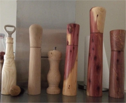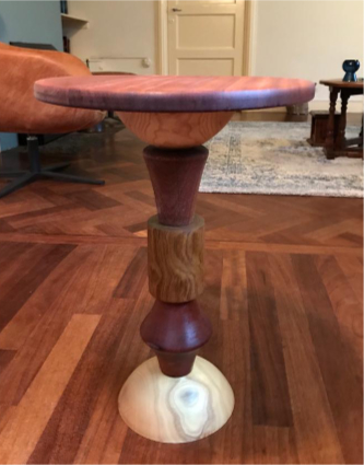Kleinste objecten die ik maak zijn houten sieraden en houten pennen. Grootste objecten zijn tafels. Het leuke aan houtdraaien is dat je in een dagdeel iets af kunt maken. Ook handig is dat je nooit hoeft na te denken over een cadeautje voor een verjaardag: al vele schalen, kandelaars, pennen, snijplanken en tafeltjes hebben hun weg gevonden. Sinds kort maken Noëlle Joosen en ik ook combinatiestukken: bijvoorbeeld houten potten met deksel van keramiek. Voor meer informatie zie mijn website.